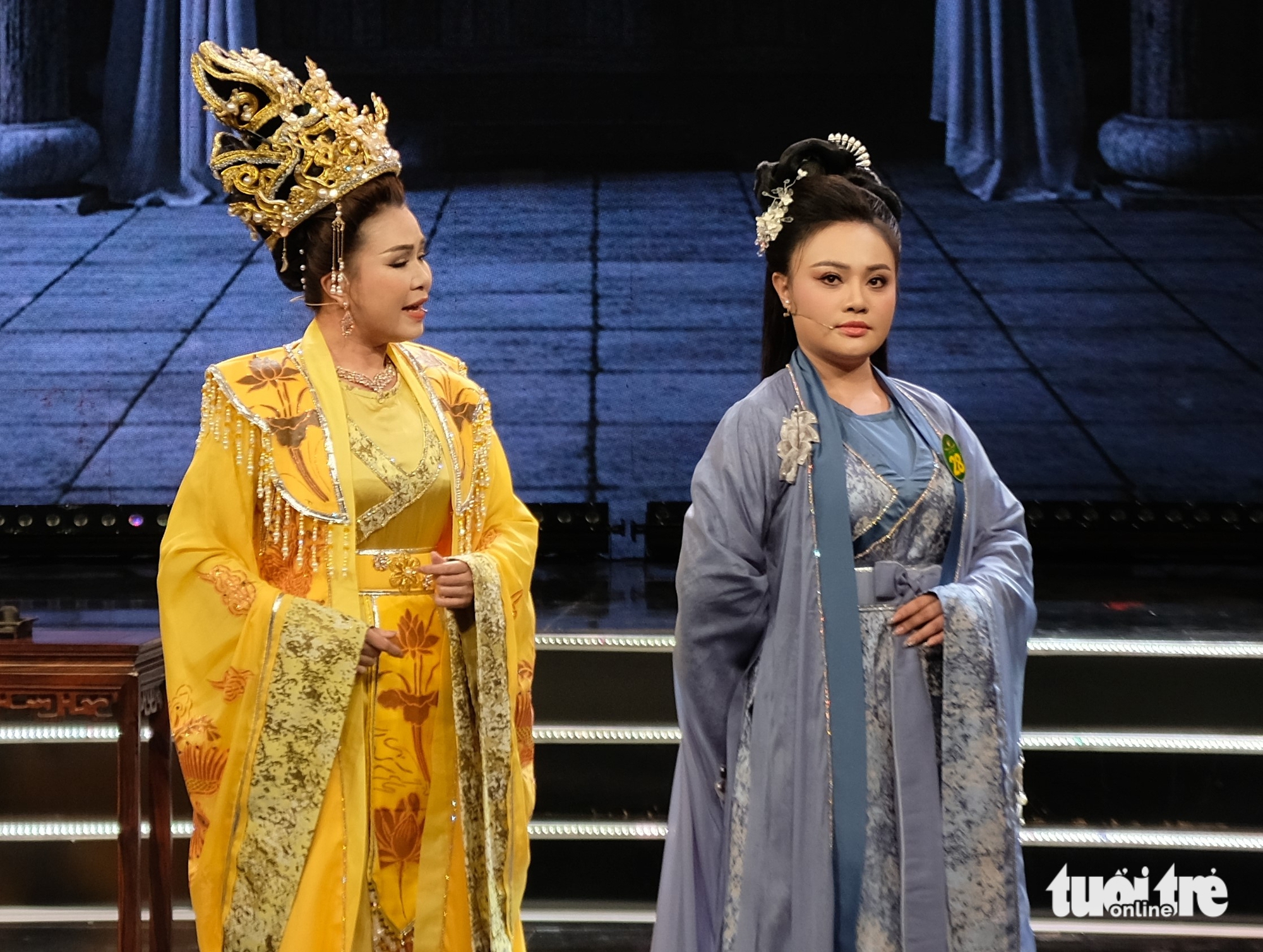 Thùy Dương (phải) và huấn luyện viên Ngọc Đợi trong trích đoạn cải lương Thượng Dương hoàng hậu - Ảnh: LINH ĐOAN