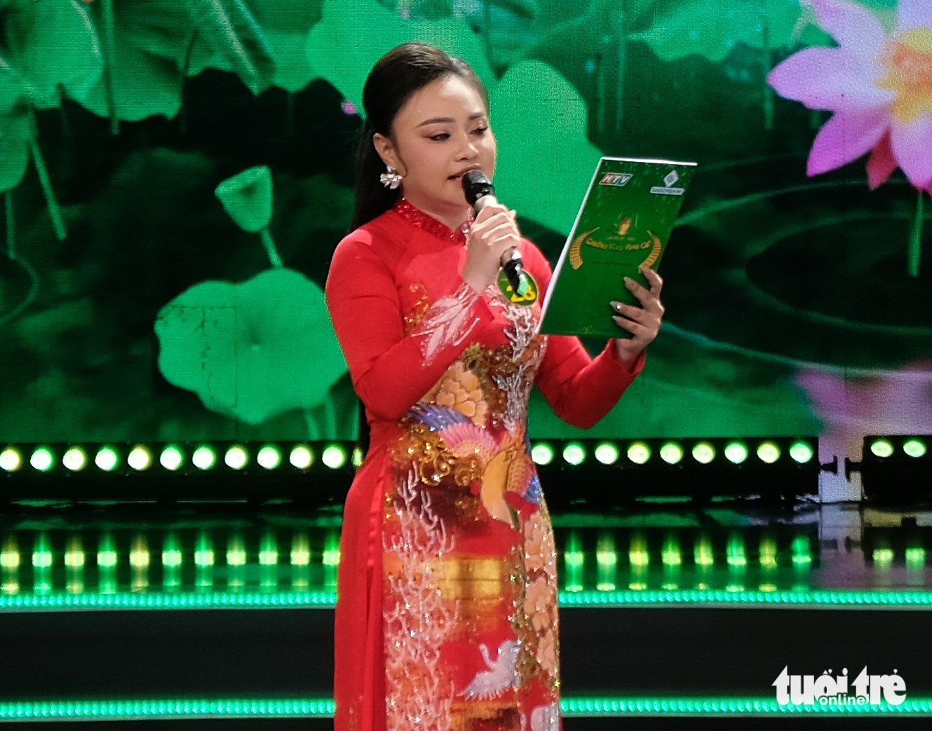 Thùy Dương thể hiện phần thi bài ca cổ bốc thăm ngẫu nhiên, cô bắt trúng bài Vương vấn sông Hồng - Ảnh: LINH ĐOAN