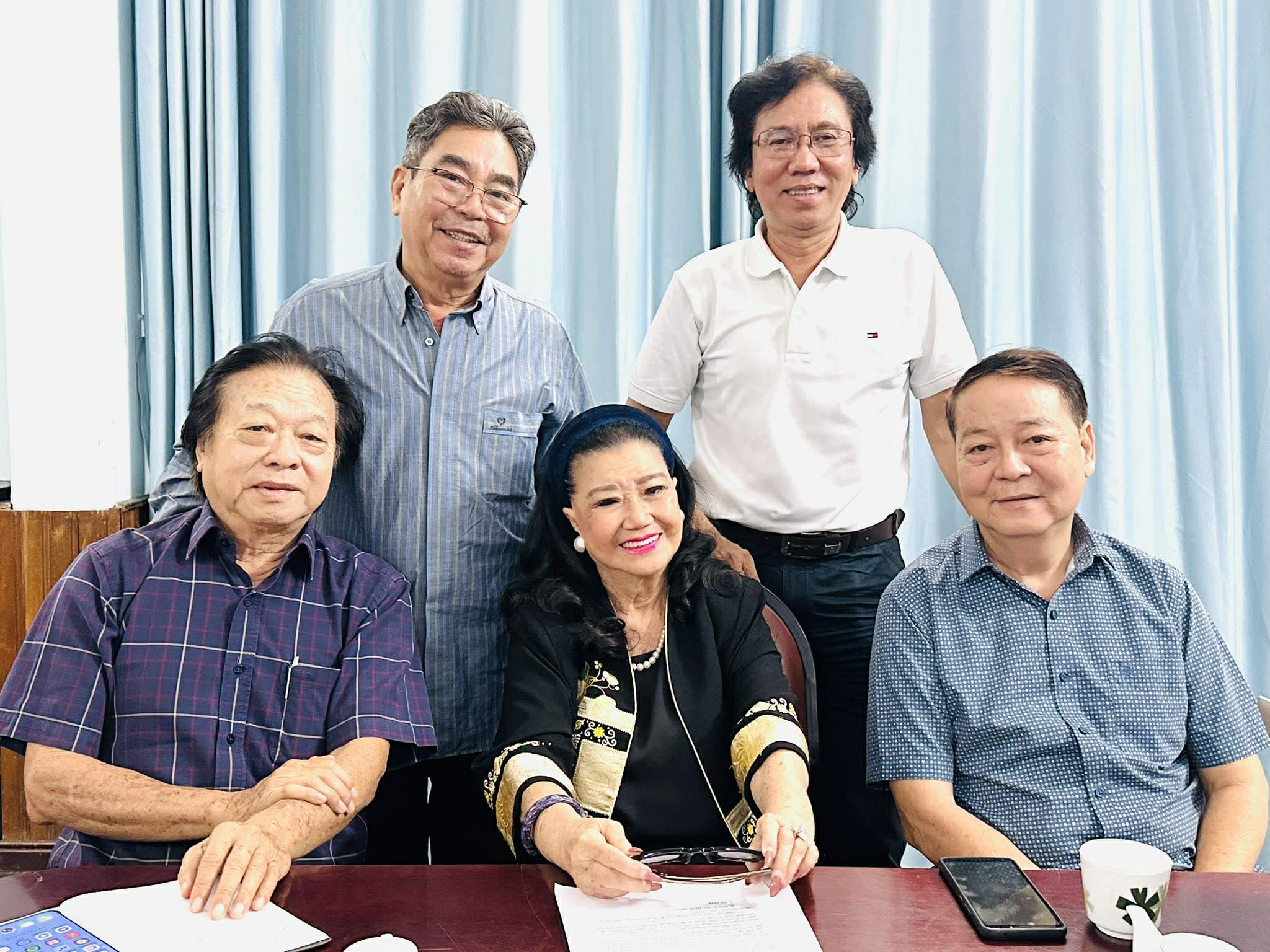 Từ trái sang: NSND Trần Ngọc Giàu, tác giả Nguyễn Trung, NSND KIm Cương, đạo diễn Việt Phong, đạo diễn Tôn Thất Cần trong ngày họp mặt