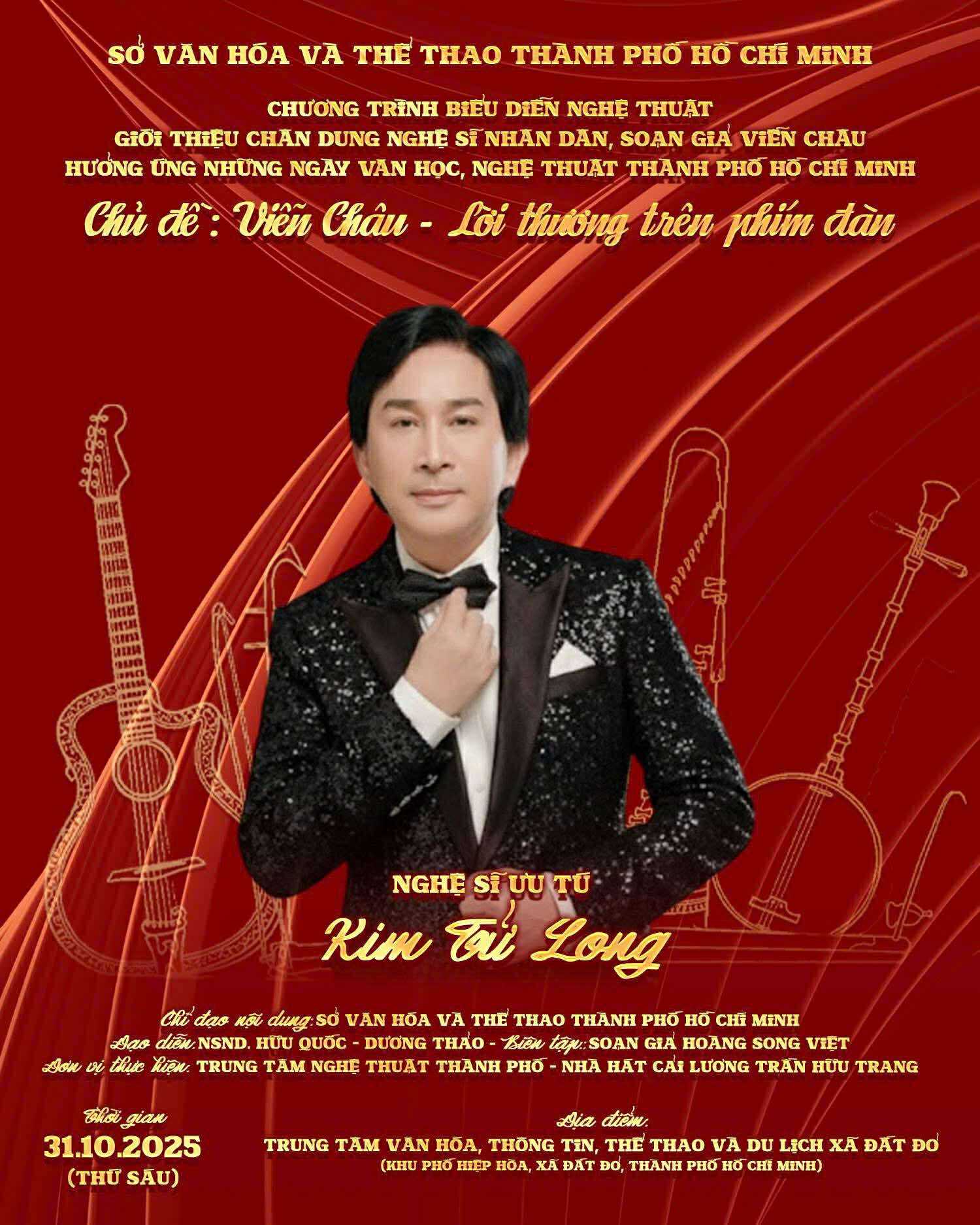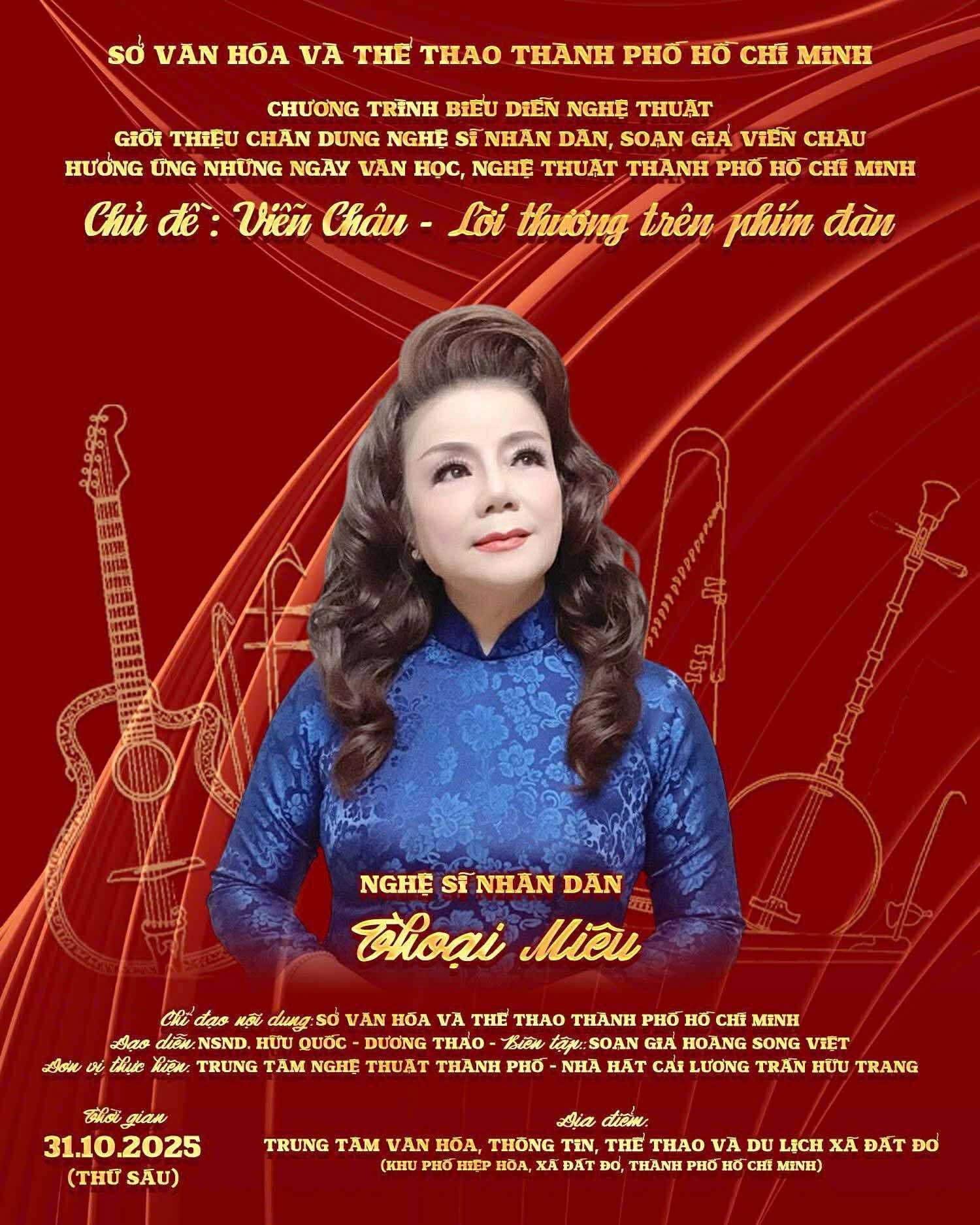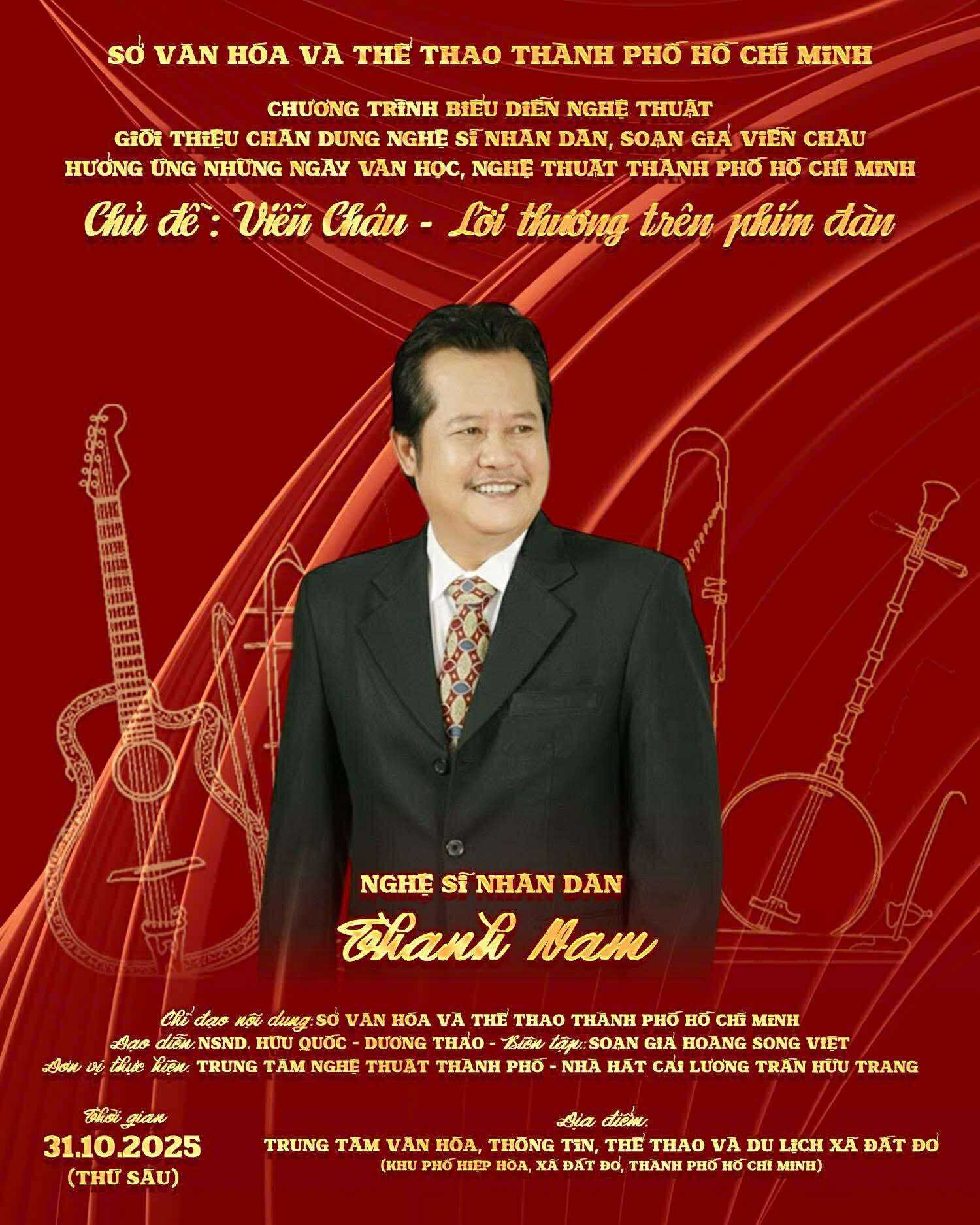 Tối 31-10-2025, tại Trung tâm Văn hóa, Thông tin, Thể thao và Du lịch xã Đất Đỏ (TP HCM), công chúng mộ điệu cải lương sẽ có dịp sống lại trong không gian nghệ thuật chan chứa tình thương và kỷ niệm qua chương trình biểu diễn nghệ thuật "Viễn Châu – Lời thương trên phím đàn", do Sở Văn hóa và Thể thao TP HCM chỉ đạo nội dung, Trung tâm Nghệ thuật Thành phố phối hợp Nhà hát Cải lương Trần Hữu Trang tổ chức.